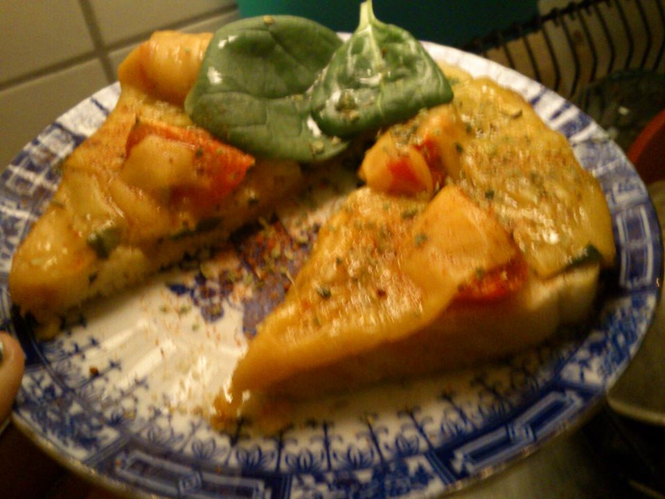 Här ovan är toast med cheddarost, körsbärstomater, vitlök, babyspenat och lite strilad grönsaksfond.